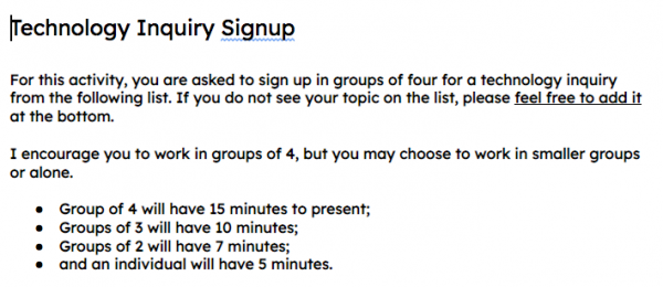 For those of you looking to review the Tech Inquiry Sign-up Sheets we reviewed in class, you can access them here: A01 Tech Inquiry Sign-up Sheet A04 Tech Inquiry Sign-up Sheet Think about the artifact you can create to leave… Continue Reading →