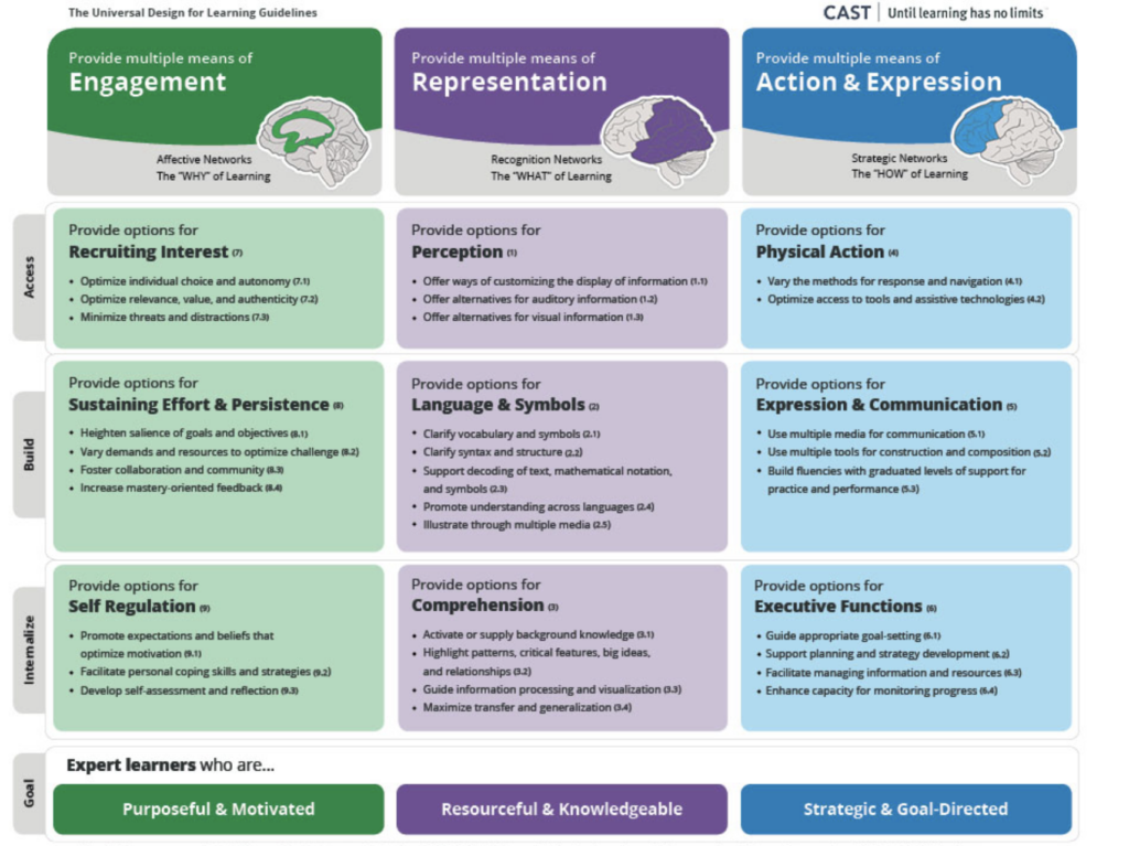 This week’s resources focused on accessibility and inclusion of educational teaching methods. For my reflection I chose to focus on the article about universal design for learning also known as UDL. UDL is a teaching framework that provides guidelines for teachers to follow in order to create the most effective learning environment for all types of learners.