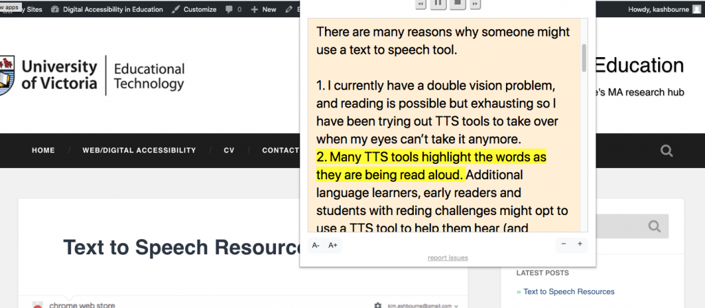 The tool is a bit clunky but it is intuitive and free so it’s a good one to try out if you want to get the experience of using TTS technology, or if you want to test if your digital content is able to be read correctly by TTS technology. (Unfortunately, not all pages can be read by this tool, including  – at the time of printing – Google’s own page promoting the Read Aloud add-on.)